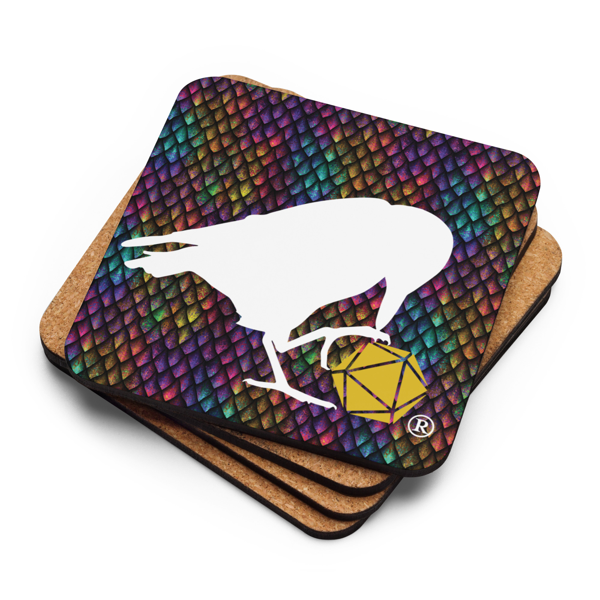 Banish beverage rings from your gaming table with this cork-backed coaster featuring our classic d20 Raven logo on a gorgeous Rainbow Dragonscale background!