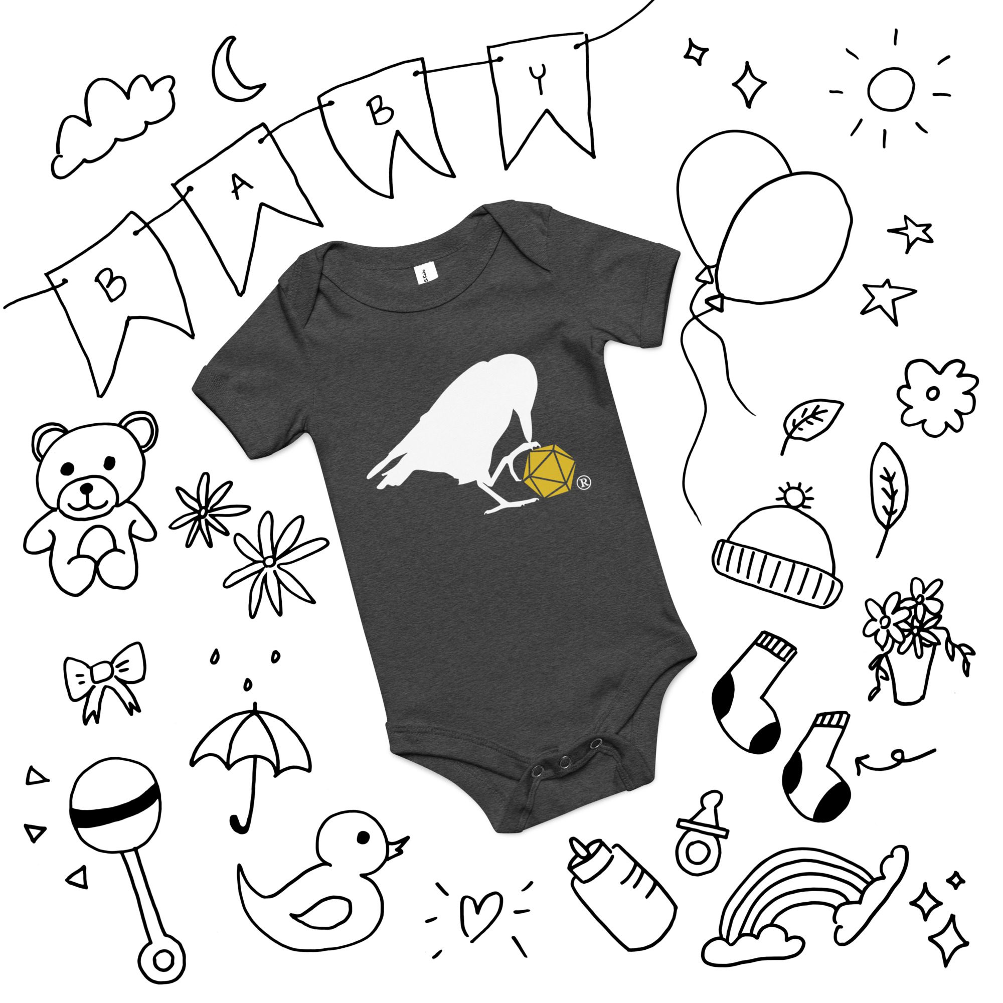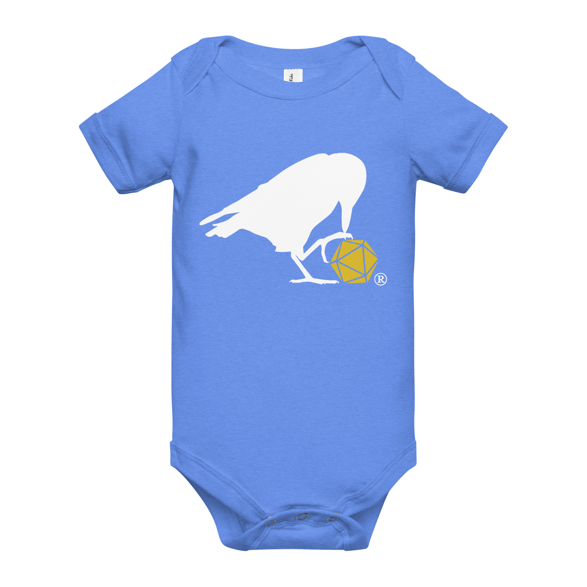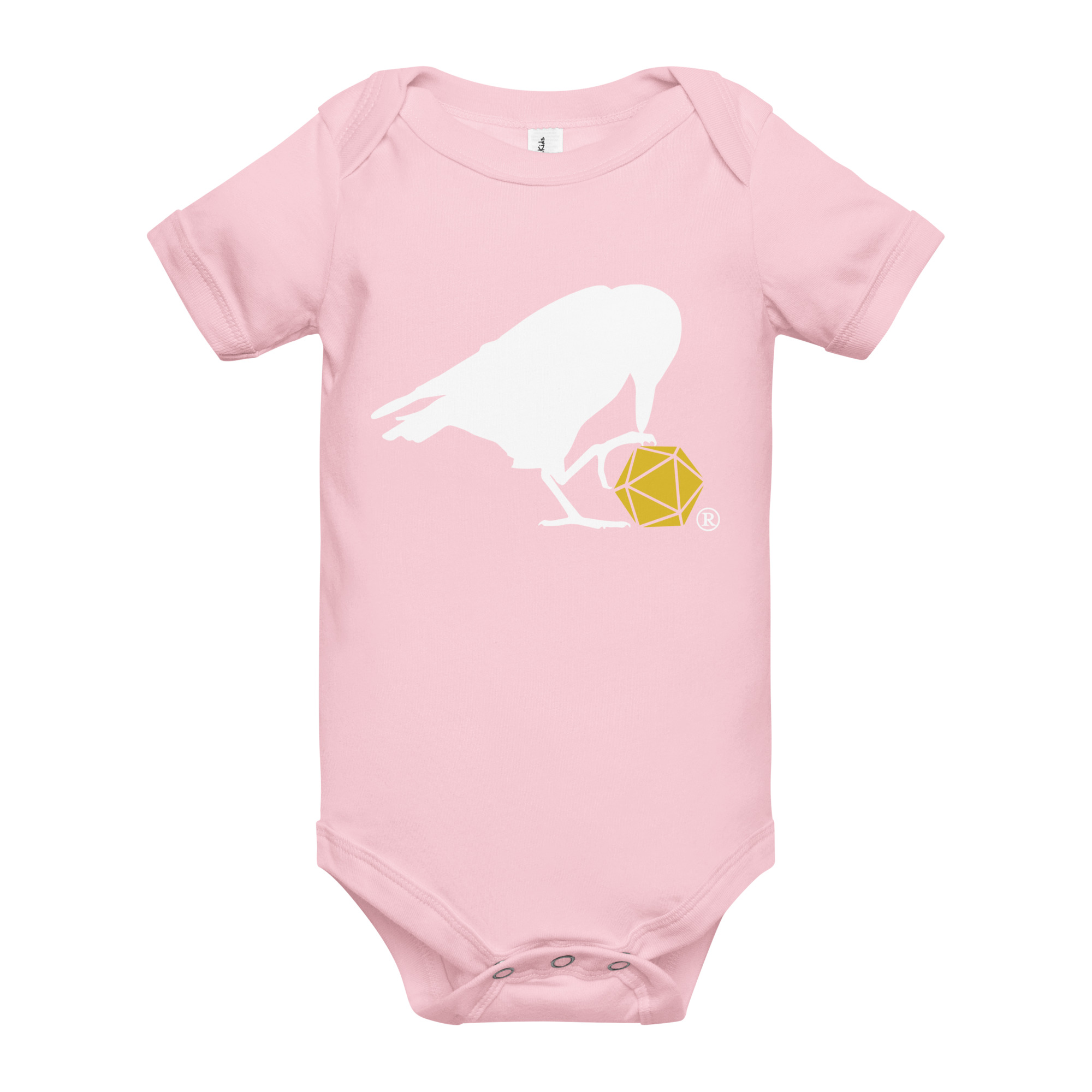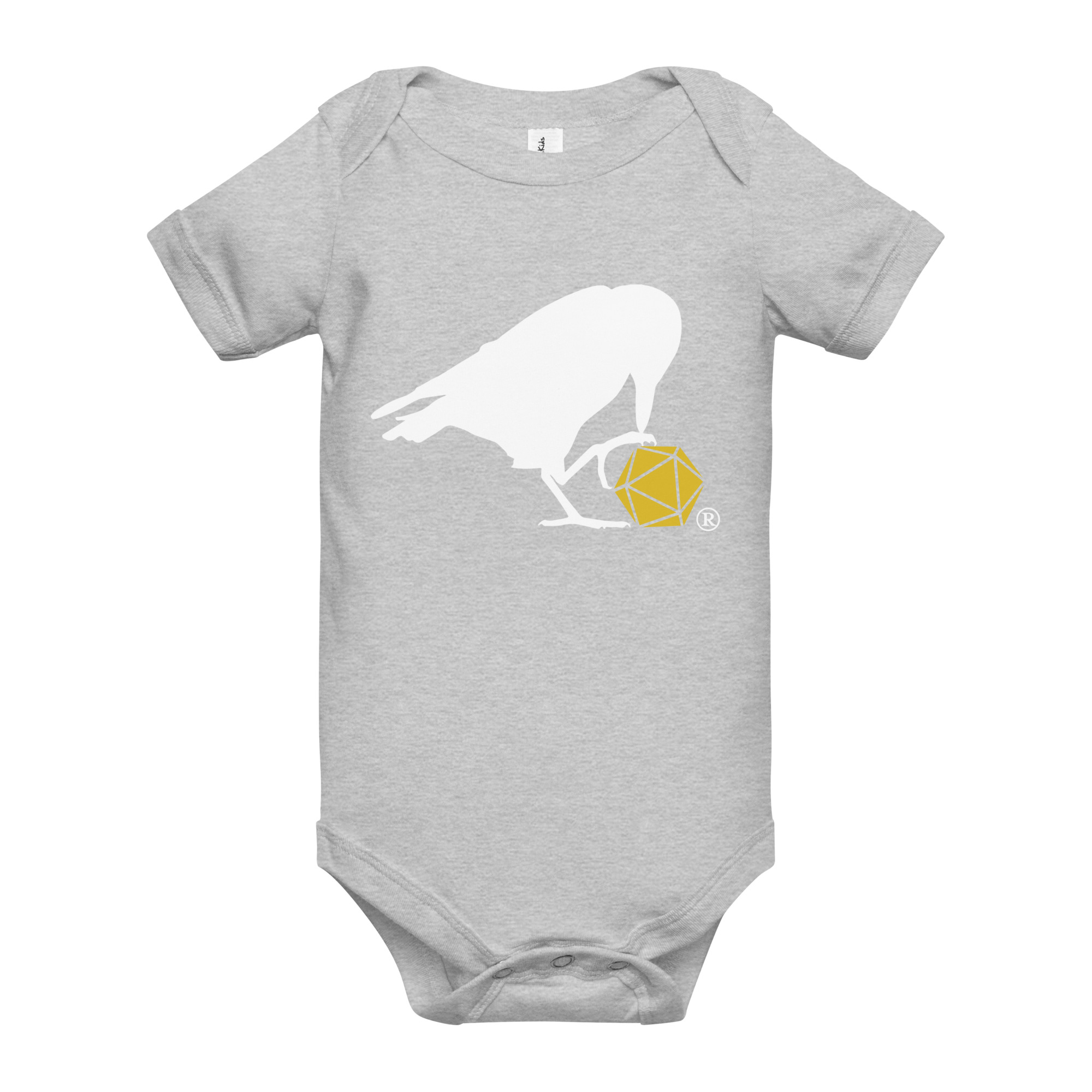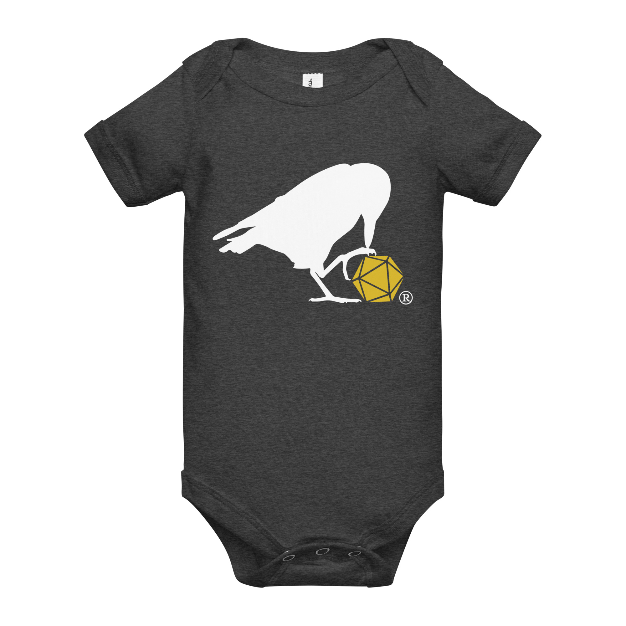 This adorable onesie features our classic d20 Raven logo!